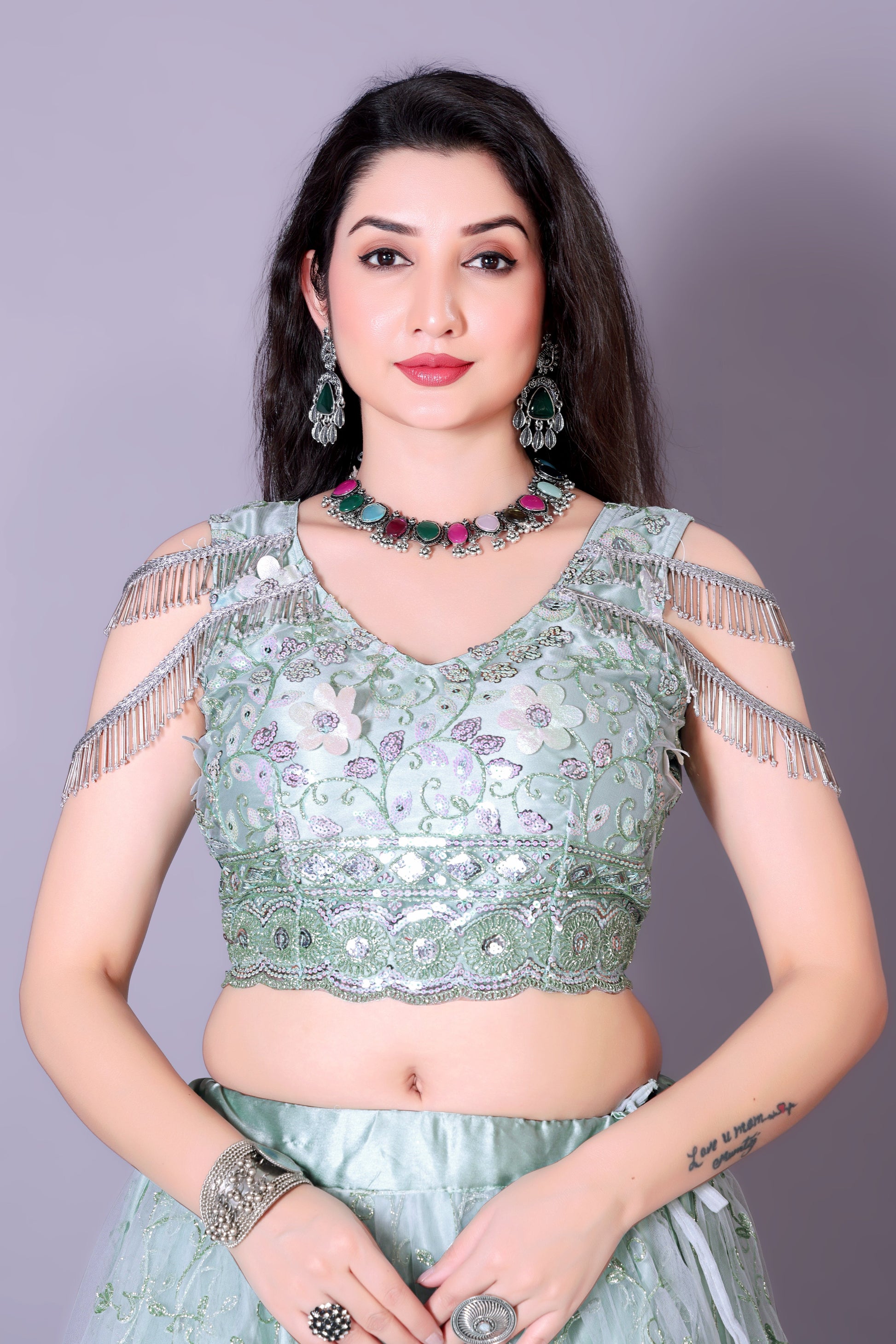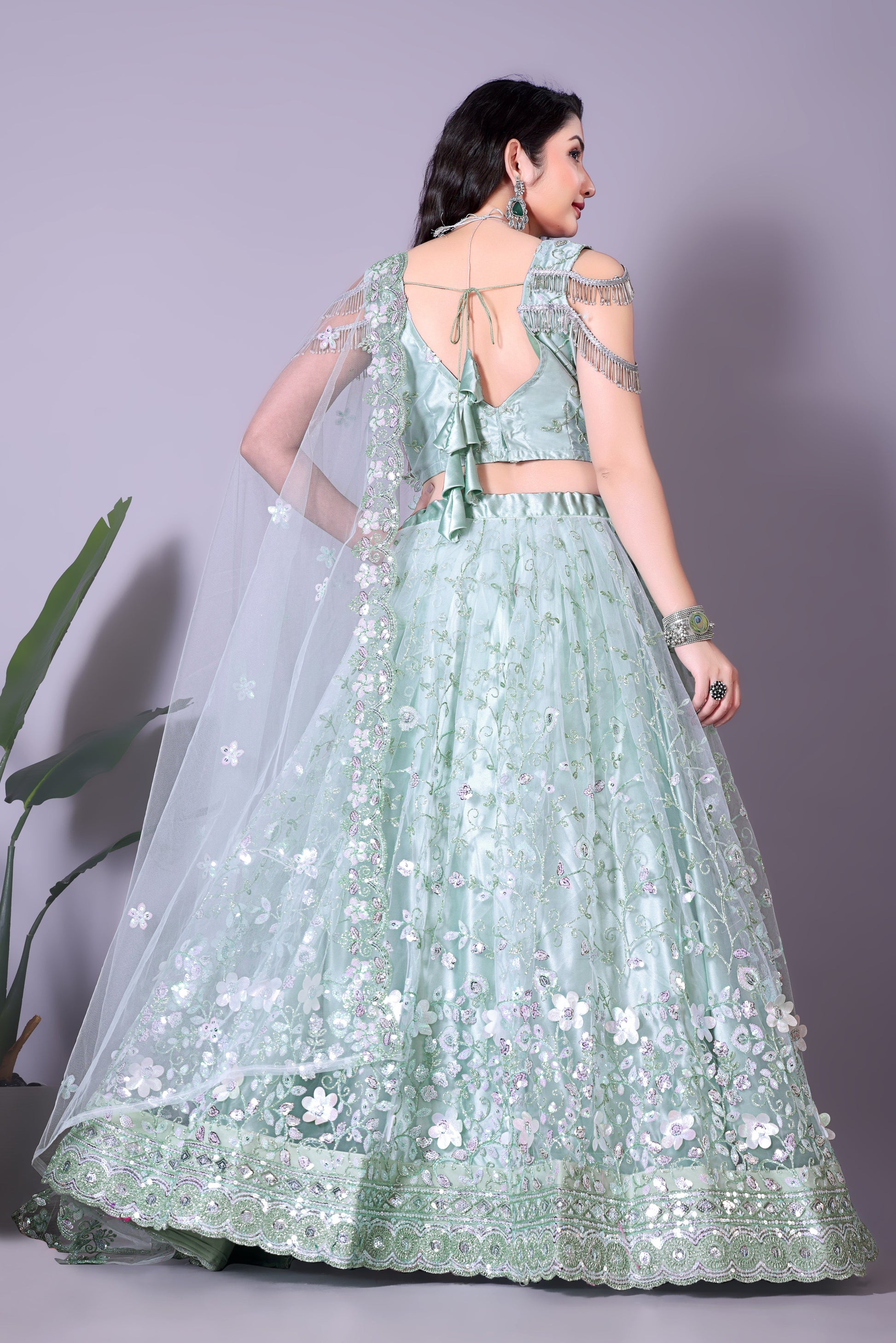 Pair this beautiful powder blue choli with a lehenga or a skirt to complete your bridal look. Whether you’re looking for a subtle yet striking ensemble or a timeless piece to cherish, this choli is a perfect choice for your engagement ceremony and other celebrations.